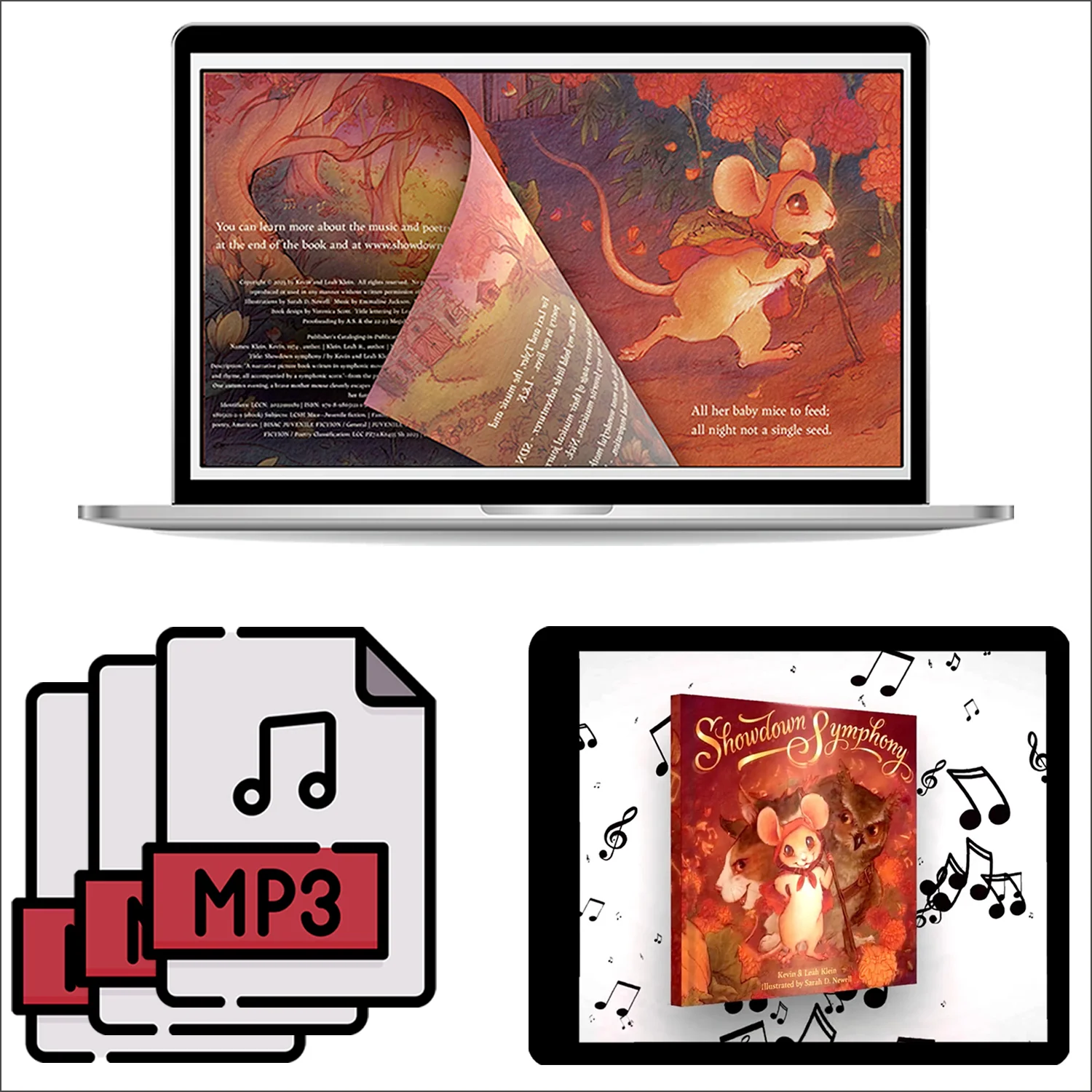 Two book video versions (one character-animated and page-turn animated) and three audio files of the book: narration only, music only, and narration + music. Enjoy the story wherever you are!